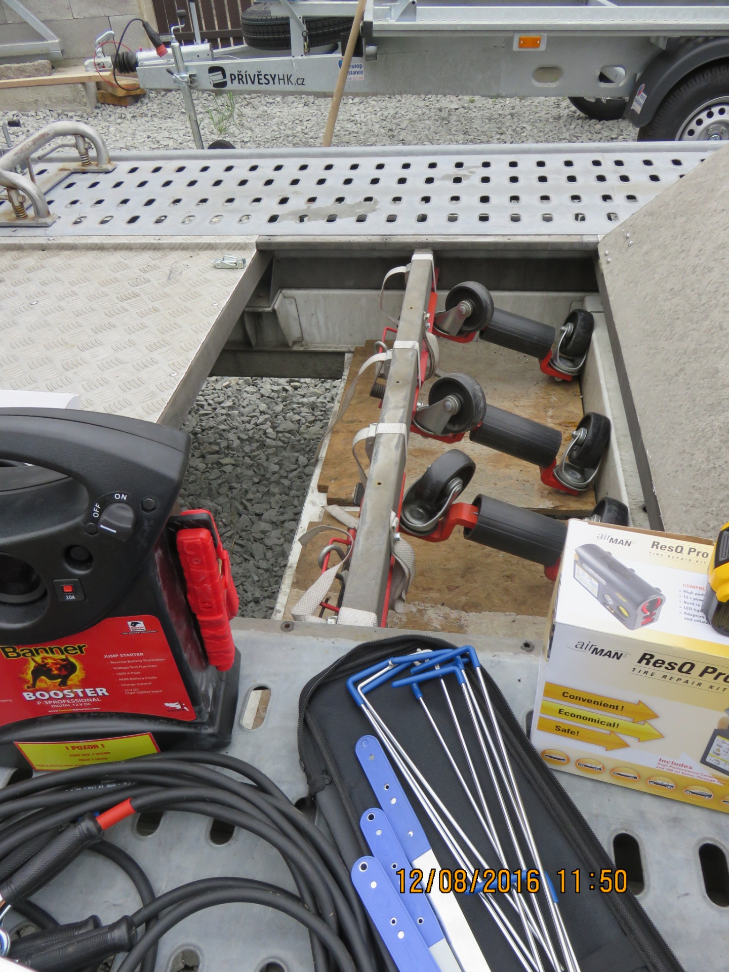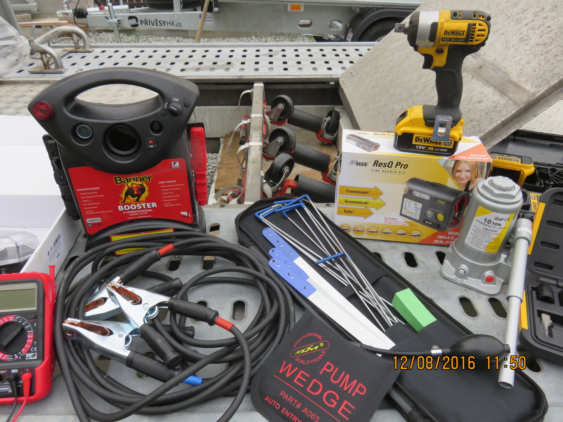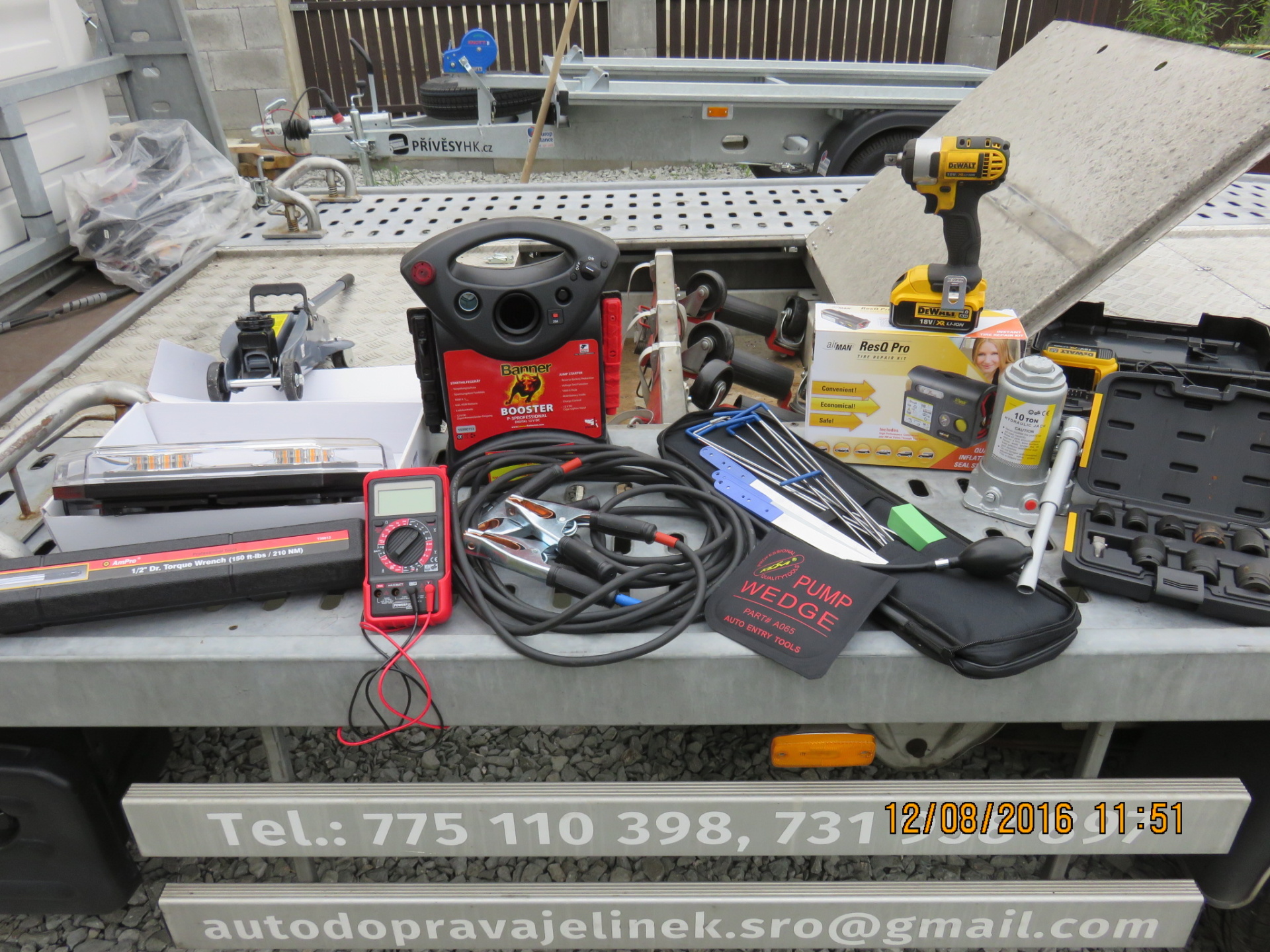 Sada na opravu pneumatik, nářadí pro výměnu kol, sada planžet + balónek na otevření vozu, startovací kabely, pojezdové vozíky, čerpadlo na benzín (záměna paliva), kanystry, držák na přepravu motorek, digitální multimetr, startovací booster, dekodéry zámků dveří vozidel (BMW, WAG, …). Certifikát na překonávání mechanického zabezpečení automobilů, potvrzení o školení „Pravidla bezpečnosti práce na dálnicích a silnicích“, kamerový systém pro ochranu přepravovaného vozu.